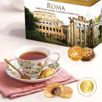 Složení: Gianduia krém 27% [glukózový sirup, cukr, voda, plnotučné mléko, palmový olej, lískooříšková pasta 5,6%, sušené odstředěné mléko, Gianduia oříšková čokoláda 3,5% (cukr, lískové ořechy, nízkotučné kakao, kakaová hmota, kakaové máslo, sušené odstředěné mléko, aromata, emulgátor sójový lecitin, nízkotučné kakao 2 %, přírodní aromata, zahušťovadlo pektin, konzervant sorban draselný], pšeničná mouka, máslo, cukr krystal, cukr, pasterovaný žloutek (vejce z volného chovu), přírodní mateřské droždí (pšeničná mouka, voda), kakaový cukr granule 4,5 % (cukr, pšeničný škrob, slunečnicový olej, nízkotučný kakaový prášek 5 %, kakaová hmota 3 %, bramborový škrob), emulgátory mono- a diglyceridy mastných kyselin rostlinného původu původ a slunečnicový lecitin, pasterovaný bílek (vejce z volného chovu), cukrový sirup, kakaový krém 0,6 % (glukózový sirup, cukr, voda, palmový olej, kakao 10 %, vaječný žloutek, sušené odstředěné mléko, sušená smetana, aromata, zahušťovadlo pektin, konzervant sorban draselný), sůl, slad z pšeničné mouky, přírodní vanilkové aroma, vanilkový extrakt z madagaskarských bobulí. Může obsahovat vlašské ořechy, mandle, pistácie a arašídy.
